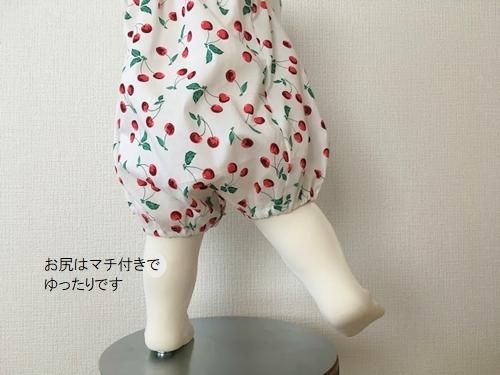 ※足回り、肩・胸周りのゴムは縫製工程上、ボトム類のウエストゴムのような後からの調節が出来ません。標準的なサイズのゴム寸法をパターンに記載しておりますが、お作りいただく際にお子様の体型によって調節してください。
