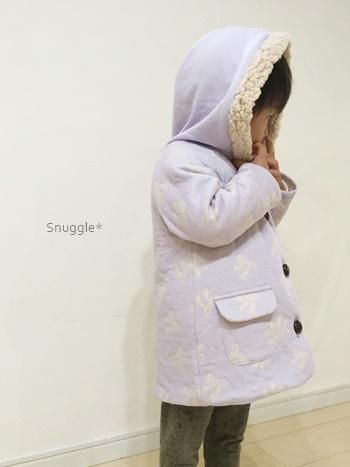 フード付きコートですが、くるくるっと丸めてフラップボタンを留めれば襟のようにフードを収納できるため、外遊びの際にも安心です。(画像参照)