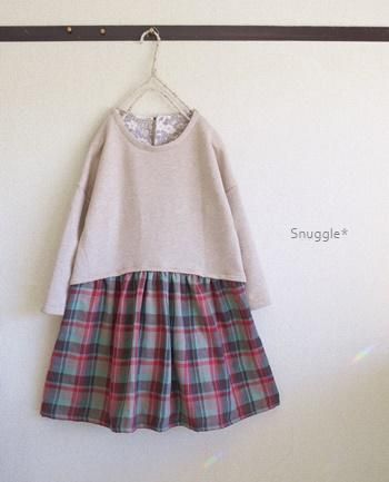 スカート丈は2つのラインを記載していますのでスカートの丈を変えるとワンピースにもなり、ニットと布帛を切り替えて作るので、色んな組み合わせを楽しめます。