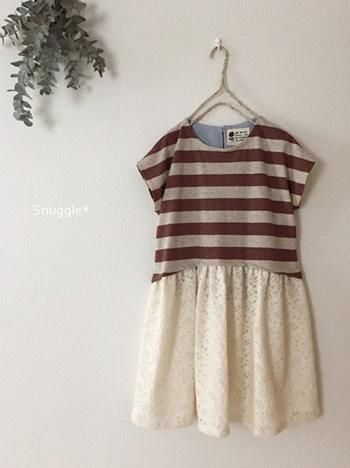 スカート丈は2つのラインを記載していますのでスカートの丈を変えるとワンピースにもなり、ニットと布帛を切り替えて作るので、色んな組み合わせを楽しめます。